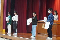 | 校長先生から、2学期を振り返って、「感動したことは?」「がんばったことは?」「素敵なことは?」と話がありました。きっと日高っ子は、たくさんの出来事を思い浮かべることができたと思います。学校集会では、たくさんの表彰があり、とても素晴らしかったです。冬休みは、家族の一員として、大掃除やお手伝いをし、家族と一緒に過ごす時間を大切にしてください。 |