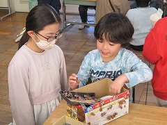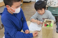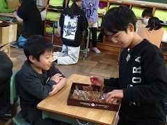 | 1年生が、秋見つけで集めたどんぐりなどの木の実を使って、松ぼっくりのけん玉やどんぐり迷路などのおもちゃを作りました。また、おもちゃで楽しんでもらうために、話し合ったり、さらに工夫したりしてきました。そして、いつもお世話になっている6年生を招待しました。1年生の説明を聞いて6年生が優しく声をかけながら遊ぶ姿はとても微笑ましかったです。 |