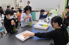 | 科学体験教室のため、夢と学びの科学体験館に行きました。水溶液の酸性とアルカリ性の性質を調べるために指示薬の色の変化を観察したり、色が変わる電気ペンの特徴を生かして絵を描いたりして、科学の楽しさに触れることができました。 |