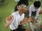 | 皆さんは化石掘りをしたことがありますか?6年生理科では化石を含んだ岩石を使って、擬似化石発掘体験の授業をしました。理科の池田先生が持ってきた岩の塊を、ハンマーとたがねで割っていきます。6年生の子どもたちは「思ったより重たいよ」「堅くて割るのに力がいるなあ」と言いながら、楽しそうに割っていました。貝のようなものが見つかった児童は、先生に「これは貝の化石ですか?」と質問をし、「そうですよ。よく見つけたね」と答えてもらい、化石を見つける喜びを味わっていました。授業の中で本物に触れるとてもよい時間でした。 |