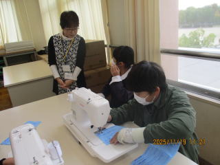 5年生はミシンの学習をしています。ミシンは上糸や下糸のかけ方、手順が覚えるまで大変です。そこで、学校サポーターのみなさんが学習のサポートをしてくださっています。「針をさす場所はここでいいんですか」「なんだか縫い目が細かくなってしまうんですが、どうしたらいいですか」など、子どもたちは分からないところを助けてもらいながら、真剣にミシンの練習をしていました。ミシンは使えるようになると大変便利な道具です。使い方を覚えたら、自分だけのエプロンづくりです。