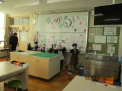 | 1年生は算数のかたちづくりで「こわされたかたち王国の町をとりもどそう」という勉強をしています。楽しく形づくりの勉強をしていた1年生の教室に「はるきんぐ」が現れて、町を壊してしまいました。これから「かたちづくり」の学習をしながら、いろいろな形を使って町を直していきます。町は直るのかな?楽しみですね。 |