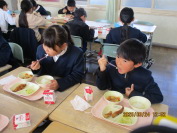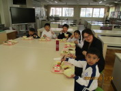日本語適応教室で勉強している児童は、週に2回、「仲よし給食」をしています。各学級から家庭科室に自分の給食を運びます。1~3年生までの児童が日本語適応教室の先生や語学指導員の先生たちと一緒に食べます。日本語や時には英語を使ってコミュニケーションをとりながら過ごします。みんなの笑い声があふれ、笑顔で楽しい時間です。