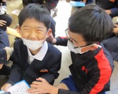 今年度最後のたてわり活動がありました。1・6年、2・4年、3・5年生がペアになり1年間一緒に活動してきました。今日はお互いにありがとうの気持ちを伝えました。6年生から手紙をもらった1年生は「ちょっと待った~私たちもあるよ~」と言ってお返しのバッグを渡していました。そのあとは各ペア学年でお絵かきゲームや折り紙をして楽しみました。5年生は、3年生が来年度から参加する委員会についての説明をしていました。楽しく有意義なひとときでした。