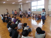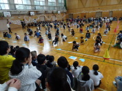第1回なかよし遊びが行われました。あいにくの雨だったので、今年はなかよしチームごとに体育館に集まりました。児童会による○×クイズに、大いに盛り上がりました。恒例の先生対決では、ハラハラ、ドキドキしながら二人の対決を見守りました。和気あいあいとクイズに取り組むことで、なかよしチームの仲も深まったようです。