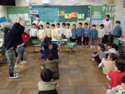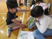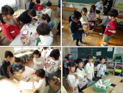 1年生児童が衣浦幼児園の年長さんを招待して、あきのおもちゃランドを開催しました。チャレンジランキングや2年生のおもちゃまつりに参加して学んだことを生かして、ドングリや松ぼっくり、木の葉など秋の物を使ったおもちゃランドになっています。「こうやるといいよ」「こっちにおいで」と優しく声をかける姿は、立派なお兄さん、お姉さんの姿でした。