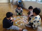 1年生が昔懐かしい遊びに挑戦しました。カルタ遊びでは、4人で輪になり、読み札2枚ずつを交替で読み、カルタ取りを楽しんでいました。