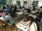 左:書き初めの1回目の授業です。前元刈谷公民館長の吉田さんを講師にお招きして、「明るい声」という題字の気をつけるべきポイントを教えてもらいました。習字の達人である吉田さんのお話を子どもたちも真剣に聞いていました。