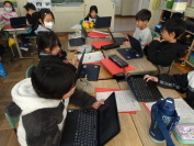 3年生は今、総合で安心・安全なくらしについて学習しています。自分たちで通学路調査をしたり、交通指導員さんに教えていただいたりして学んだことを1,2年生に伝えたいと調査報告をまとめています。自分たちで台本を作り、まとめのスライドやクイズを考え、仲間と一緒に準備を進めています。学級を解体して、発表内容によってチームが組まれていますが、どのチームも協力を大事にしていました。また、新しくなったタブレットが「使いやすい」と、彼らのがんばりを後押ししてくれています。