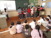 3年生が総合で学習してきたことを1,2年生に伝える会を行いました。それぞれ通学地域ごとに分かれ、通学路や住んでいる地域の危険な箇所について、自分たちが作ったスライドを見せながら説明しました。「ここは、建物があるから危険です。車や自転車が来るかもしれないけど、見にくいからです」と、分かりやすく話すと、低学年の子たちは真剣に聞いていました。低学年のことを考えて行動する様子を見て、3年生が一回り大きくなったなと感じました。