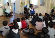 1年生の子は読み聞かせが大好きです。どのクラスに行っても絵本をじいっと見つめて、レンジャーさんのお話に聞き入っていました。雪組では、いろいろな動物の鳴き真似を一緒に楽しんでいましたよ。