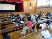 昨日、今日とに分けて、4年生から6年生までの全員が、日本の伝統和楽器である箏の体験をしました。初日は4年生と5年生で、クラスごとに1時間ずつでしたが、講師の先生方の師範演奏「春の海」を聴いた後、御指導を受け、あれよあれよという間に音を奏でることができるようになりました。どの学年も、6月頃に音楽の授業でも経験しているので、飲み込みが早いです。今日体験した6年生は、「さくら」の曲に飾り音をつけて、より高度な演奏方法に挑戦しました。