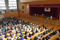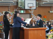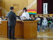 修了式と学校集会を行いました。修了式では、修了証書を各学年の代表が受け取りました。代表はもちろん、修了証を受け取る代表に合わせて礼をするみんなも、大変立派な姿でした。特に5年生の姿がすばらしく、学校のリーダーとしての自覚を感じました。学校集会では、各学年の代表が本年度がんばったこと、進級してからがんばりたいことを大きな声でしっかりと発表することができました。