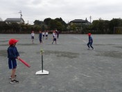 今、体育ではベースの上にボールを置いて打つ、Tボールを行っています。これなら、動かない球を打つので誰でも打つことができ、楽しく球技ができます。