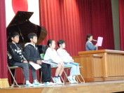 この春の異動で転退職された先生方にお越しいただき、離退任式を行いました。6名の先生方が来校され、一人ずつ最後のメッセージとして、子どもたちへの思いや感謝の言葉を伝えてくださいました。子どもたちからは、感謝の手紙や花束、歌のプレゼントを贈り、会場はあったかい雰囲気に包まれました。