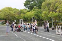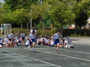 1年生の1組と2組が合同で体育を行っていました。集合も声をかけ合いながら、素早く並ぶ姿が見られ、協力していることが伝わってきました。その後、50m走に挑戦しました。「がんばれ、がんばれ」と励まし合う言葉が響き、みんな全力で走る姿がとてもすてきでした。