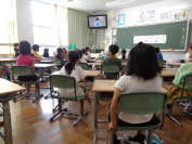 夏休み中の工事で、教室にプロジェクタとスクリーンが設置されました。早速、スクリーンに運動会の演技の動画を映してみんなで視聴したり、Teamsのクラス会議を行ったりしている学級もありました。4年生の学級では、夏休みの思い出を発表していました。クラスみんなで顔を見合いながら、発表している友達の話を肯きながら聞いています。