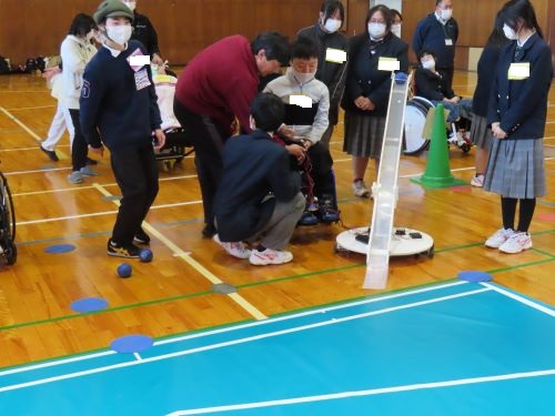 ボッチャでは両校ミックスのチーム戦を行いました。入念に位置を確認しています。