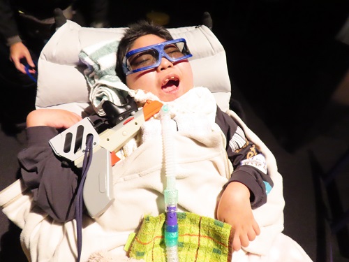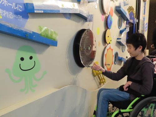 右手で一生懸命にスイッチを操作して投げる瞬間。みんな固唾を飲んで見守ります。