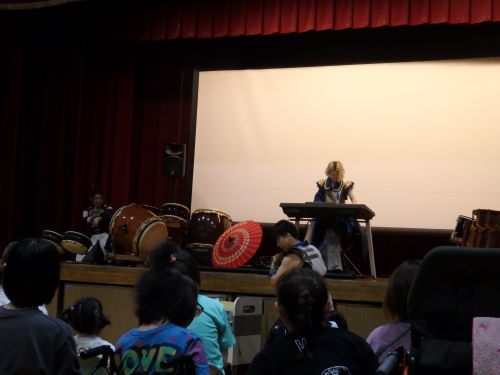 和太鼓演奏鑑賞では、和太鼓・篠笛・エレクトーンの音が合わさったとても迫力のある演奏に、リズムに乗って楽しみました。